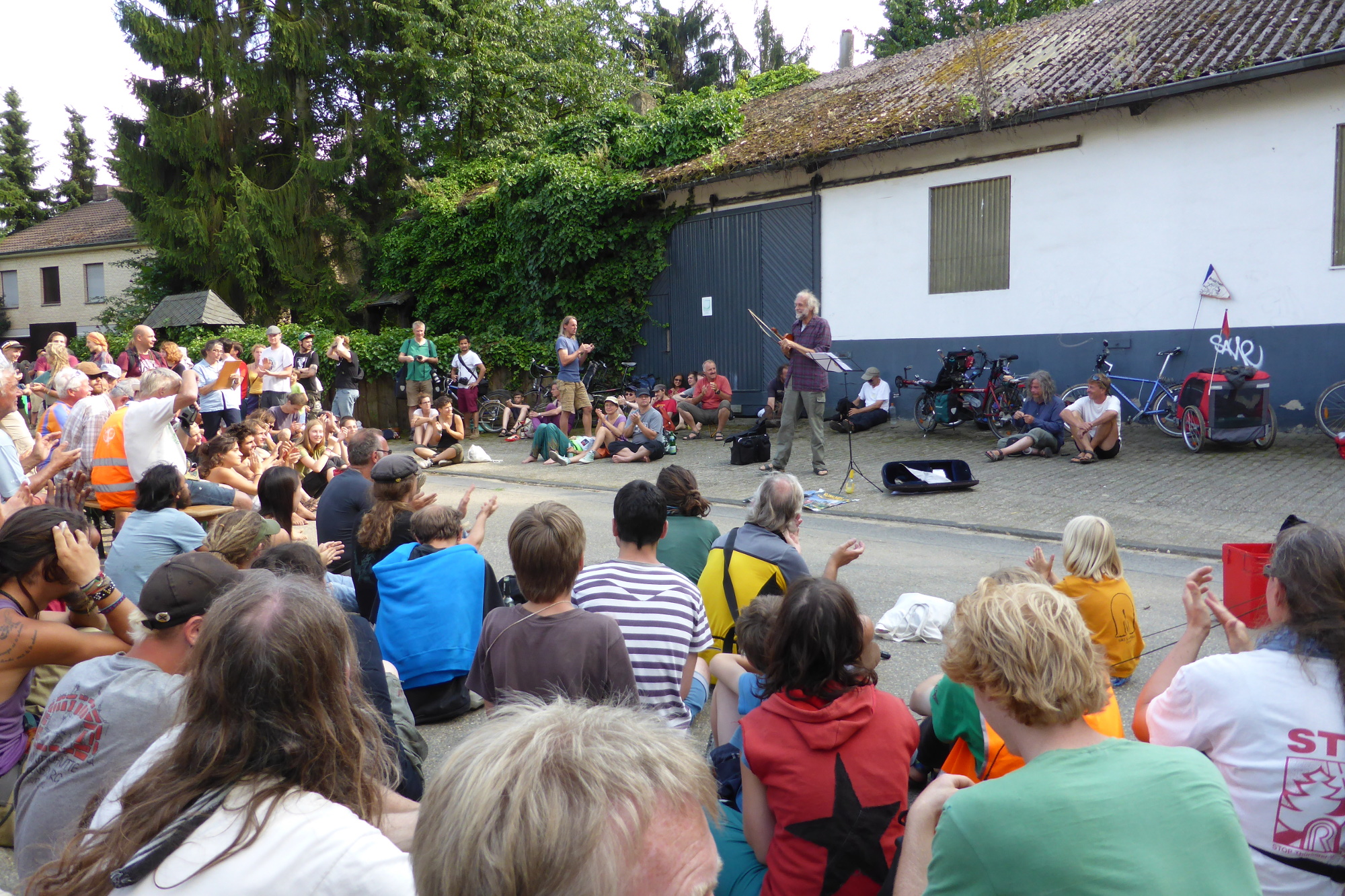 Weiter ging es direkt an der Lochkante des Tagebau Garzweilers bis nach Borschemich. Dort angekommen, wurde direkt das Straßenfest aufgebaut. Die Teilnehmer*innen hatten die Möglichkeit ihre Meinung zu Kohle auf eine Karte zu schreiben, welche dann gesammelt durch die Tour de Natur der Landesregierung von NRW übergeben werden. Es gab Crepes und Getränke; die Tour de Natur führte ein Theaterstück auf; Klaus der Geiger und die niederländische Widerstands-Folk-Band Sprank spielten vor bewegender Kulisse und am Abend wurde kurzer Hand auch die Podiumsdiskussion mit Nico Paech und Friederike Habermann nach Borschemich verlegt. Bis ca. 22 Uhr diskutierten noch etwa 200 Personen zu Wegen, Perspektiven und Ansätzen einer Postwachstumsökonomie.